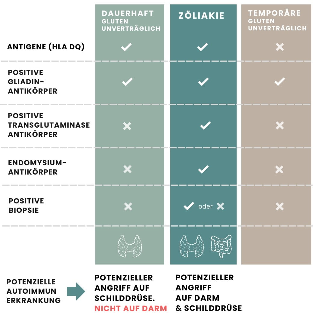 Das folgende Schaubild hilft bei der Diagnostik und Unterscheidung von Glutensenibilität und Zöliakie66Schilddrüsenunterfunktion und Hashimoto anders behandeln: Wenn Sie sich trotz normaler Blutwerte schlecht fühlen. Die 22 Muster der Schilddrüsenunterfunktion. Dr. Datis Kharrazian S.43/45
